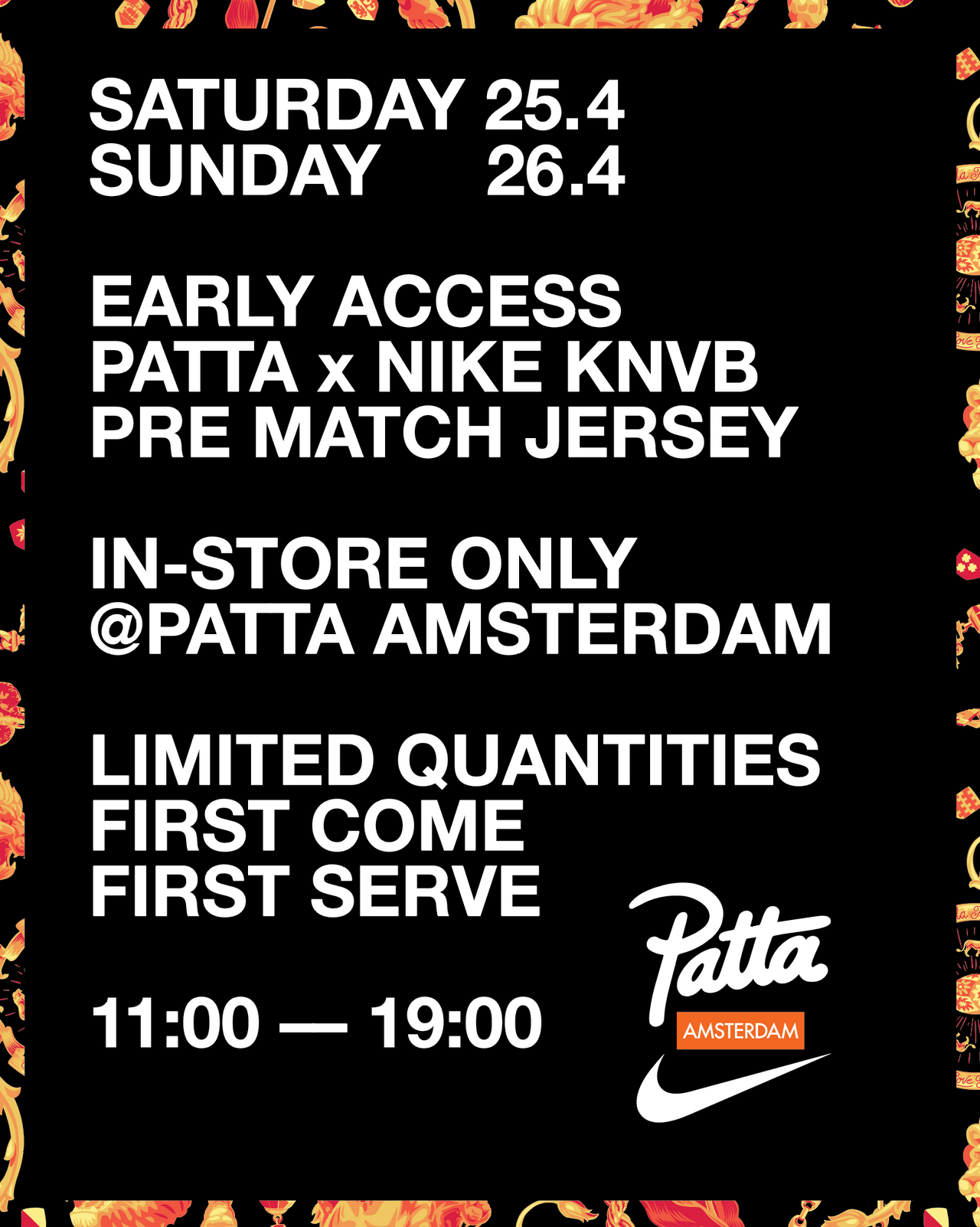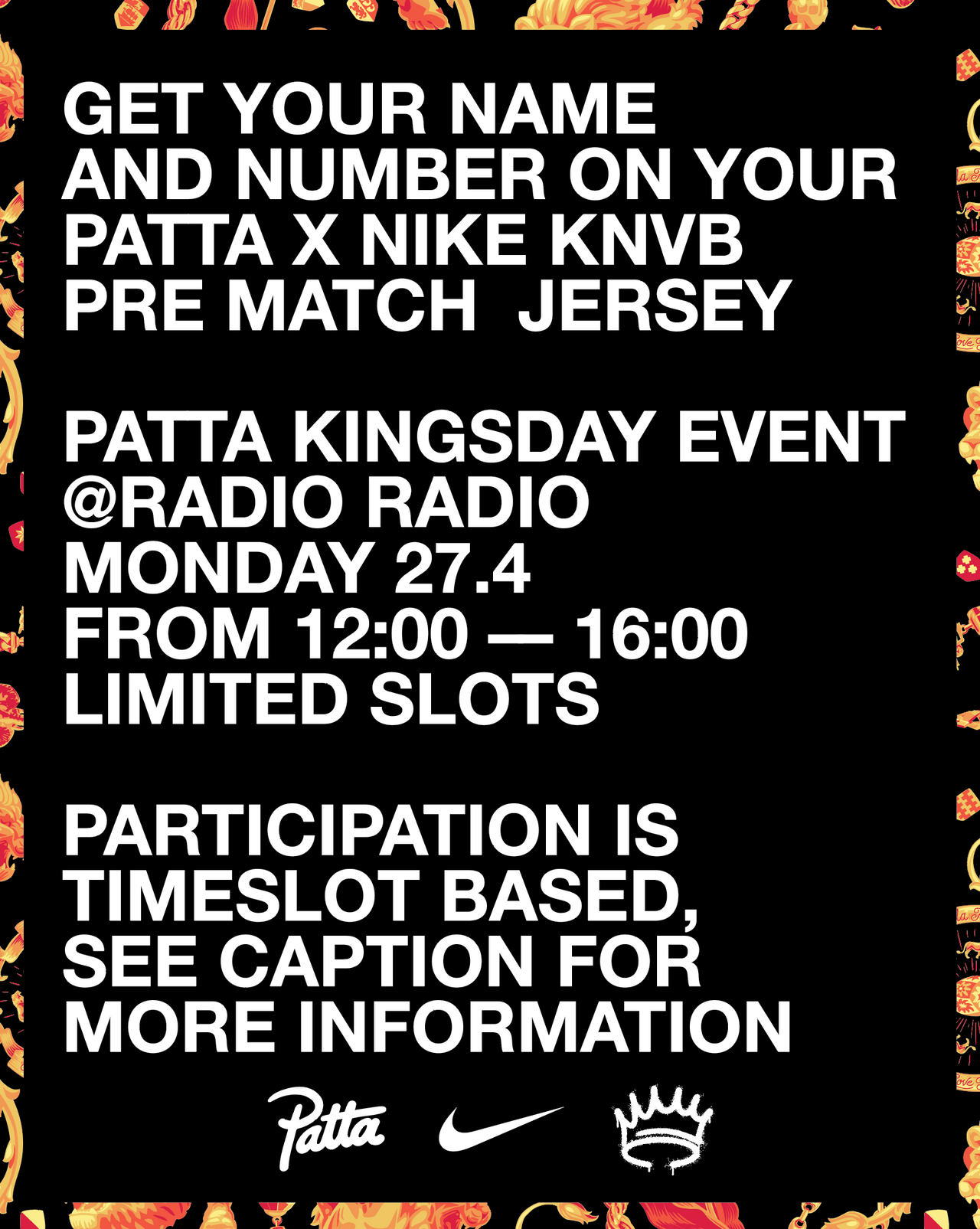 On Saturday, April 25th and Sunday, April 26th the Patta x Nike KNVB Prematch Jersey will be  available for early access exclusively at Patta Amsterdam. Buy your jersey, sign up for customization and secure your slot for Kingday.